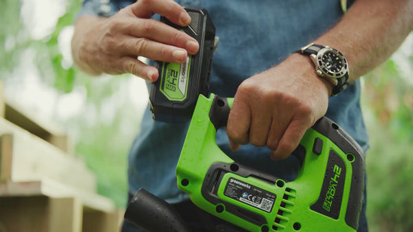 The brushless motor delivers power and efficiency for longer runtimes and higher performance than equivalent brushed motor models. As part of the Greenworks 24V family, the battery can be used in our full range of power tools, as well as lawnmowers, grass trimmers, hedge trimmers, chainsaws and more.